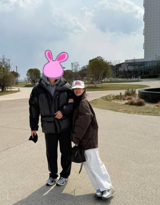 마지막 사진에서는 스티커로 얼굴을 가린 남성도 등장했다. 손예진의 남편인 현빈으로 추측되는 상황. 손예진은 이 남성에 팔짱을 끼고 기대고 있다.