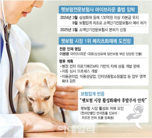 펫보험 시장 1위를 차지하고 있는 메리츠화재와의 경쟁도 본격화할 것으로 보인다. 마이브라운은 소액단기전문보험사로 예비 허가를 받은 만큼 병원 전자 의료기록(EMR) 기반의 자체 상품 개발과 판매, 자동심사 프로세스를 개발에 나설 계획이다. 아울러 미용관리업, 미용상담업, 인터넷종합쇼핑몰업 등으로 업무 영역을 점차 확대할 전망이다.
