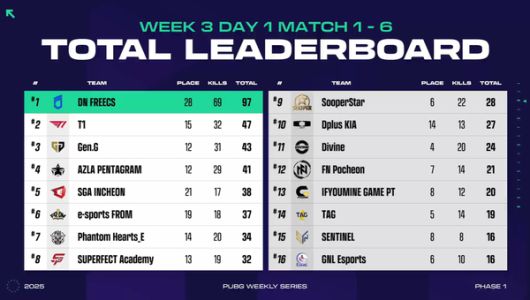 한편 PWS: 페이즈1 3주 1일차 경기에서는 DN 프릭스 외에도 2위 T1 3위 젠지 4위 아즈라 펜타그램 5위 SGA 인천 6위 e스포츠 프롬 7위 팬텀 하츠 8위 슈퍼펙트 아카데미 등이 맹활약을 펼쳤다.
