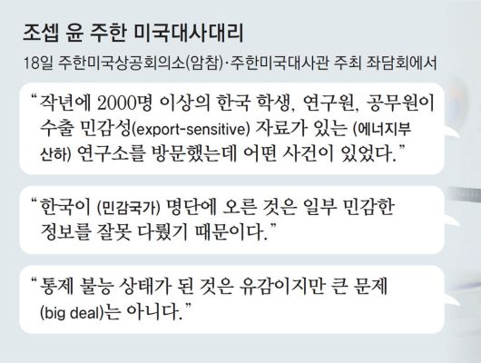 다만 윤 대사대리는 로스앨러모스, 아르곤 등 미국 핵 및 원자력 기술 개발에 핵심적인 역할을 하는 연구소들을 언급한 뒤 “작년 한 해에 보통 2000명 이상의 한국 학생, 연구원, 공무원들이 반출되면 안 되는 수출 민감(export-sensitive) 자료들이 있는 이곳들을 방문했다”고 했다.