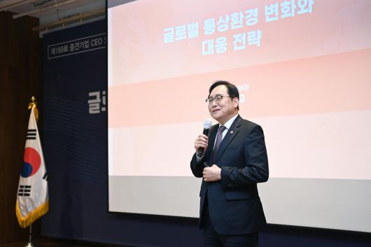 이날 강연은 다음 달 2일 트럼프 2기가 전 세계를 상대로 상호관세 부과를 예고한 상황에서 통상 당국의 대미 통상 대응과 협상 전략에 대해 중견기업계에 설명하는 자리였다.