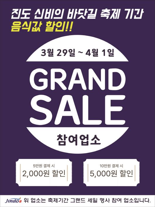 진도군은 오는 3월 29일부터 4월 1일까지 4일간 개최되는 2025년 신비의 바닷길 축제를 맞이하여 지역 내 일반음식점과 협력해 특별 할인 행사를 진행한다고 밝혔다.