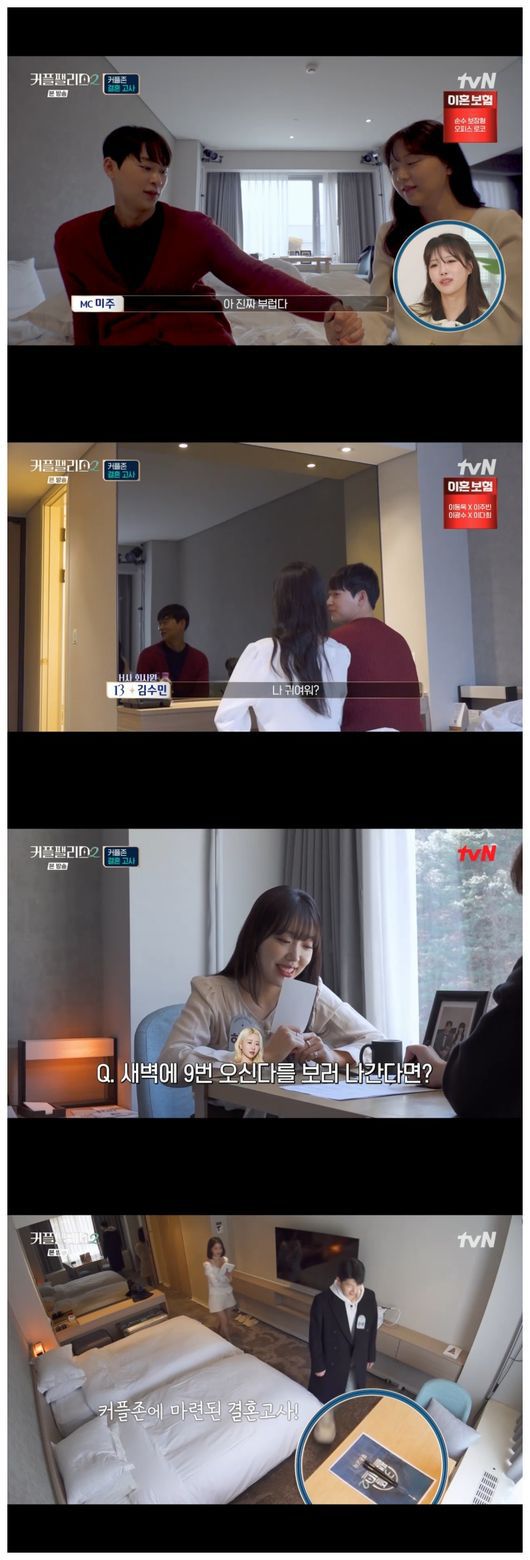 조영석과 김수민 커플은 “당연히 괜찮다”, “완전히 괜찮다. 오히려 고맙다”라며 반대되는 통하는 마음을 확인했다. 이어 ‘상대 핸드폰 비밀번호를 공유해야 한다면?’라는 질문엔 조영석과 김수민 커플은 “그건 좀 난감하다”, “좀 그렇다”라며 난색을 표했다. 이들은 서로 통하는 마음을 또 한번 확인했다.