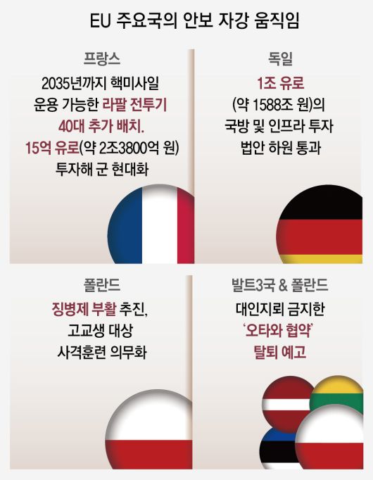 특히 EU 최대 경제대국인 독일 의회는 같은 날 최대 1조 유로(약 1590조 원) 규모의 국방 및 인프라 투자 계획을 담은 법안을 통과시켰다. 프랑스 또한 핵미사일의 운용이 가능한 라팔 전투기 40대를 추가 배치하고 15억 유로(약 2조3800억 원)를 군 현대화에 투자하기로 했다. 우크라이나와 국경을 맞댄 폴란드, 발트 3국(에스토니아·라트비아·리투아니아)은 러시아의 군사 위협에 맞서겠다며 1997년 체결된 대인지뢰 금지 협약 ‘오타와 협약’을 탈퇴하겠다고 예고했다.