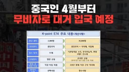 해당 게시글은 중국인 무비자 입국 제도가 다음 달부터 시행됨에 따라 숙련기능인력(E-7-4) 비자 쿼터가 2천 명에서 3만5천 명으로 확대되면서 중국인이 대거 입국할 것이라는 내용을 담고 있습니다.
