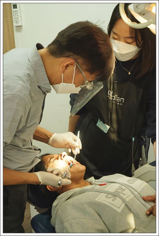 양현봉 강북다인치과의원 대표원장이 서울 종로구 대학로 ‘함께아시아’ 진료소에서 외국인 노동자에게 진료를 하고 있다. |