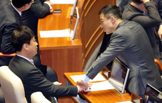 김상욱 국민의힘 의원과 정성국 의원이 지난해 12월10일 오후 서울 여의도 국회에서 열린 제418회국회(정기회) 제18차 본회의에서 손을 잡고 있다. /사진=뉴시스화상 |
