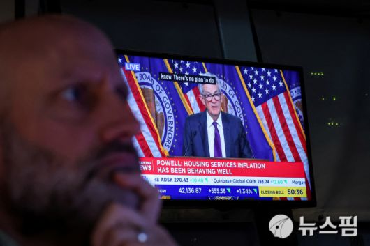 19일(현지시간) 파월 기자회견 주시하는 뉴욕 증권거래소의 한 트레이더 [사진=로이터 뉴스핌] |