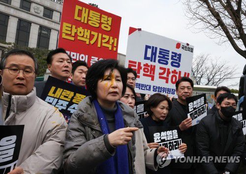 (서울=연합뉴스) 임형섭 안정훈 기자 = 더불어민주당 의원들이 20일 윤석열 대통령의 파면을 촉구하는 기자회견을 열었다가 주위에서 던진 날계란에 맞는 일이 발생했다.