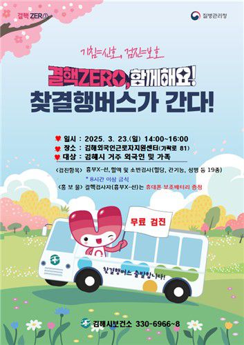 이번 무료 결핵 검진은 예약 없이 현장 참여할 수 있으며 문의는 김해시보건소(☎055-330-6967~8)로 하면 된다.