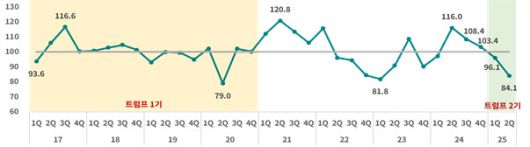 한국무역협회 국제무역통상연구원이 20일 발표한 ‘2025년 2/4분기 수출산업경기전망조사(EBSI)’ 보고서에 따르면, 2분기 EBSI는 84.1로 2분기 연속 100을 하회해 전 분기 대비 수출 경기가 더욱 악화될 것으로 나타났다.