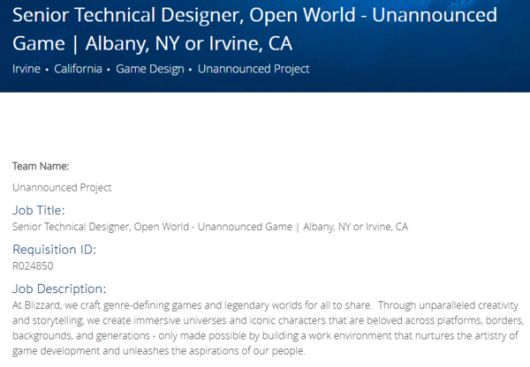 블리자드는 최근 자체 채용공고를 통해 오픈 월드 AAA급 멀티플레이어 게임 개발 인력을 구인 중이다. 선임 테크니컬 디자이너를 포함해 언리얼 엔진 5를 사용해 오픈 월드를 구현할 능력이 있는 이들을 모집 중이다.