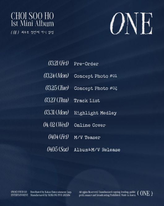 소속사 포고엔터테인먼트는 20일 11시 공식 사회관계망서비스(SNS)를 통해 최수호의 첫 미니앨범 ‘원’(ONE) 스케줄러를 공개하고 발매 소식을 알렸다.