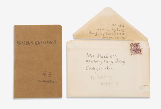 1962년 연말 박수근이 미국인 지인인 산드라 마티엘리에게 보낸 연하장과 연하장 봉투. 겉면에 '수근 Soo Keun Park'이라는 친필 서명이 적혀 있다. [국외소재문화유산재단 제공] |