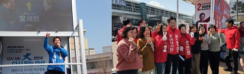 (아산=연합뉴스) 유의주 기자 = 4·2 재보선 공식 선거운동 첫날인 20일 충남 아산시장 재선거에 출마한 여야 후보가 잇따라 출정식을 열고 승리를 다짐했다.