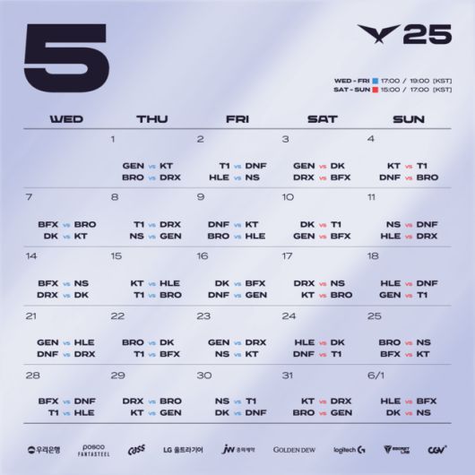 매주 수요일부터 일요일까지 진행되는 2025 LCK 정규 시즌은 운영에서도 변화를 가져갈 예정이다. 기존에는 오후 5시에 시작한 1경기가 2-0으로 마무리 되더라도 2경기를 오후 7시 30분에 시작했지만 이번 시즌부터는 오후 7시에 2경기를 시작하기로 했다. 오후 3시에 1경기를 시작하는 주말의 경우 2경기 시작 시간은 오후 5시이다.