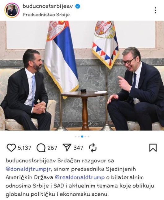 돈 주니어와 부치치 대통령 양쪽 모두 이번 회동을 통해 얻으려는 점이 분명했다. 부치치 대통령의 경우 돈 주니어와의 친분 과시를 통해 미국이 자신의 정권을 지지한다는 점을 보여주고 싶어 했다. 현재 정치적 지지 기반이 상당히 취약하기 때문이다. 세르비아에서는 지난해 11월 기차역 지붕이 무너지는 사고로 15명이 사망하면서 시작된 반정부 시위가 4개월째 규모를 키워가면서 정권이 위기에 몰렸다.