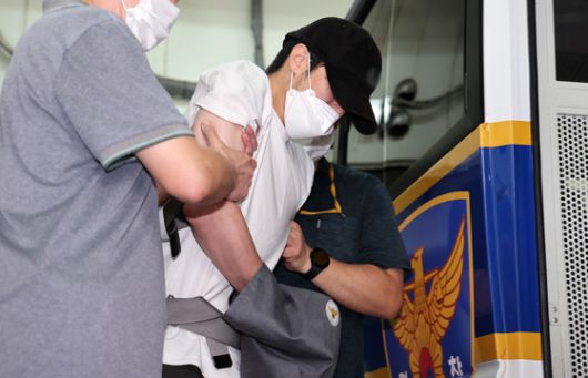 자신이 운영하는 태권도장에서 5살 남자아이를 심정지 상태로 빠뜨린 관장이 지난해 7월 19일 경기 의정부경찰서에서 검찰로 송치되고 있다. 뉴스1 |