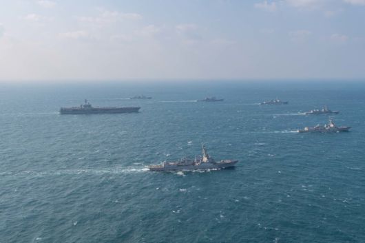 [서울=뉴스핌] 박성준 기자 = 지난 17일부터 20일까지 제주 남장 공해상에서 진행된 한미일 해상훈련에서 참가 함정들이 기동하는 모습. 이번 훈련에는 우리 해군 이지스구축함 세종대왕함 등 2척, 미국 해군 제1항모강습단 소속 항공모함 칼빈슨함 등 4척, 일본 해상자위대 구축함 이카즈치함 1척 등 총 7척이 참가했다. [사진=국방부] 2025.03.20 parksj@newspim.com |
