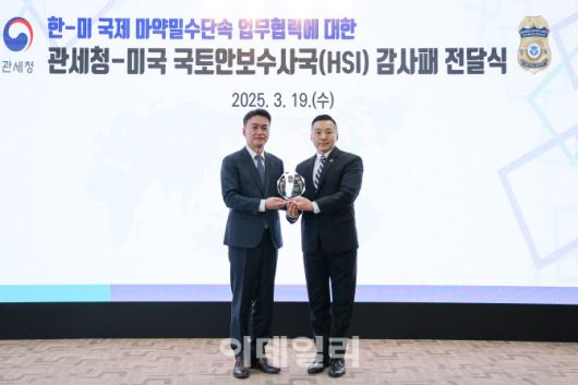 [세종=이데일리 하상렬 기자] 관세청은 미국 국토안보부 산하 국토안보수사국(HSI)으로부터 국내 수사·정보기관 최초로 마약단속 업무협력 감사패를 받았다고 20일 밝혔다.