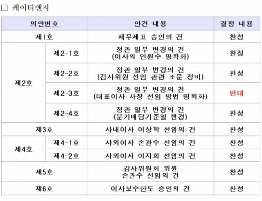 KT&G는 앞서 정관에 '집중 투표의 방법에 의해 이사를 선임하는 경우 대표이사 사장과 그 외의 이사를 별개의 조로 구분한다'는 조항을 넣기로 하고 주총 안건으로 상정했다. 대표이사를 따로 선임할 경우 집중투표제 효력이 떨어질 수 있어 논란이 일어 왔다.