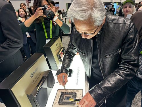 그는 삼성 부스에 전시된 제품을 보고 "이것이 GDDR7인가"라고 물어본 뒤 삼성 관계자가 "맞다"고 답하자 사인했다.