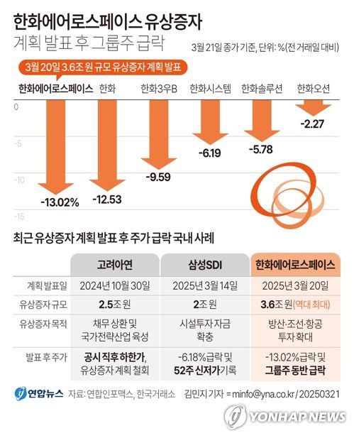 (서울=연합뉴스) 김태균 기자 = 방위산업체 한화에어로스페이스[012450]가 사상 최대 규모인 3조6천억원의 유상증자를 전격 발표하면서 증권가에서는 주식시장에 미칠 여파에 촉각을 곤두세우고 있다.