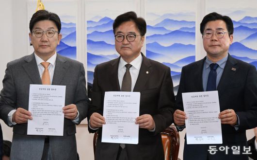 우원식 국회의장과 국민의힘 권성동 원내대표(왼쪽), 더불어민주당 박찬대 원내대표(오른쪽)가 20일 서울 여의도 국회의장실에서 국민연금 개혁안에 합의한 뒤 합의문을 들고 기념촬영 하고 있다. 이훈구 기자 ufo@donga.com |