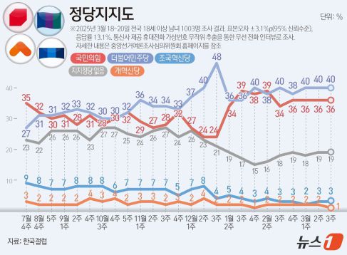 윤 대통령 탄핵 소추 직후(지난해 12월 셋째 주) 국민의힘 지지도는 24%까지 추락하며 민주당(48%)과 격차가 두 배에 달했지만, 민주당이 한덕수 국무총리를 탄핵한(12월 27일) 이후 보수 결집이 이어지면서 반등했다. 1월 셋째 주에는 39%로 민주당(36%)을 앞서기도 했다.