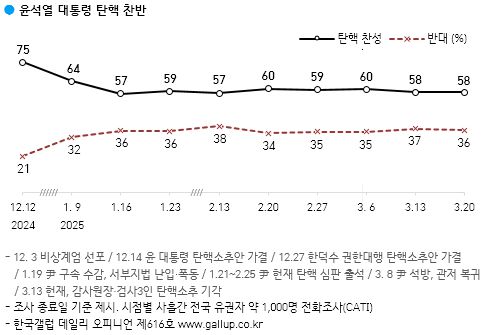 22일 정치권에 따르면 한국갤럽이 18~20일 전국 만 18세 이상 유권자 1003명을 대상으로 한 조사에서 윤 대통령 탄핵 찬성은 58%, 반대는 36%로 나타났다. 찬성은 지난주와 같았고, 반대는 1%포인트(p) 감소에 그쳤다.