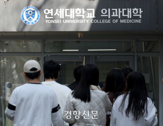 연세대·고려대·경북대 의대의 1학기 등록 마감 예정일인 3월21일 서울 서대문구 연세대 의과대학으로 학생들이 들어가고 있다. 권도현 기자 |