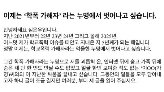 심은우는 21일 SNS에 장문의 입장문을 올려 “2021년부터 올해까지 학폭 이슈로 괴로운 시간을 견뎌왔다. 이제는 그 누명에서 벗어나고 싶다”고 토로했다.