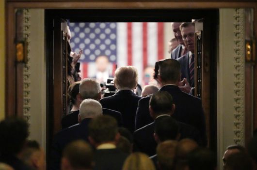 4일 상·하원 합동 연설을 하러 입장하는 트럼프 대통령(가운데). 워싱턴=AP 뉴시스 |