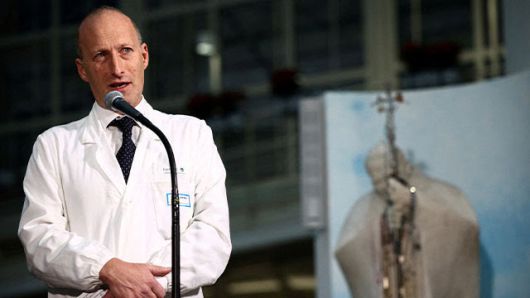 2일(현지시간) 프란치스코 교황이 입원 중인 로마 제멜리 병원에서 열린 기자회견에서 세르조 알피에리 외과과장이 발언하고 있다. (사진=로이터/연합뉴스). |