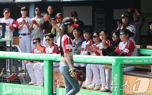 (서울=뉴스1) 김진환 기자 = 23일 서울 송파구 잠실야구장에서 열린 '2025 신한 SOL 뱅크 KBO리그' 롯데 자이언츠와 LG 트윈스의 경기, 더그아웃 LG 선수들이 시구를 마친 걸그룹 (여자)아이들 미연을 향해 손뼉을 치고 있다. 2025.3.23/뉴스1