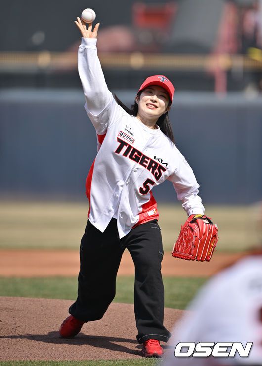 [OSEN=광주, 조은정 기자]23일 광주KIA챔피언스필드에서 2025 신한 SOL Bank KBO리그 KIA 타이거즈와 NC 다이노스의 경기가 열렸다. 홈팀 KIA는 양현종을, 원정팀 NC는 라일리를 선발 투수로 내세웠다. 경기 전 쇼트트랙 국가대표 김길리가 시구를 하고 있다. 2025.03.23 /cej@osen.co.kr