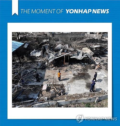 (산청=연합뉴스) 손형주 기자 = 경남 산청군에서 발생한 산불 사흘째인 23일 경남 산청군 시천면 외공마을에 주택이 불이 타 주민들이 걱정스럽게 바라보고 있다. 2025.3.23 [THE MOMENT OF YONHAPNEWS]
