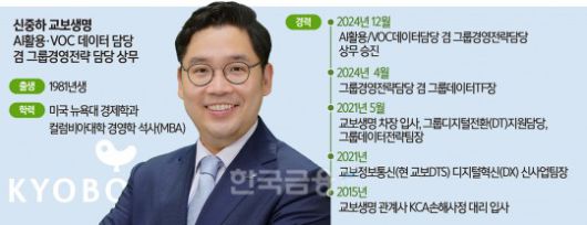 신중하 상무는 교보그룹 계열사에 입사한 지 10년만에 임원으로 승진했다. 신중하 상무는 작년 임원인사를 통해 AI활용/VOC데이터담당 겸 그룹경영전략담당으로 교보생명 AI와 그룹 전반 전략을 담당하며 본격적으로 경영 전반에 나서게 됐다.