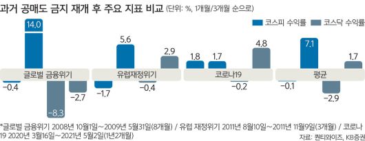 과거 사례를 보면 공매도 재개 이후 1개월 내외로 지수 변동성이 커지지만 이후에는 안정되는 것으로 나타났다. 2008년 글로벌 금융위기 때에는 공매도 재개 후 1개월간 코스피가 0.4%, 코스닥은 8.3% 각각 하락했지만 3개월 후에는 코스피는 14.0% 상승하고 코스닥은 2.7% 하락한 것으로 나타났다. 2020년 코로나19 당시에는 1개월 수익률이 코스피 1.8%, 코스닥 -0.2%로 단기 영향도 크지 않았던 것으로 파악됐다.