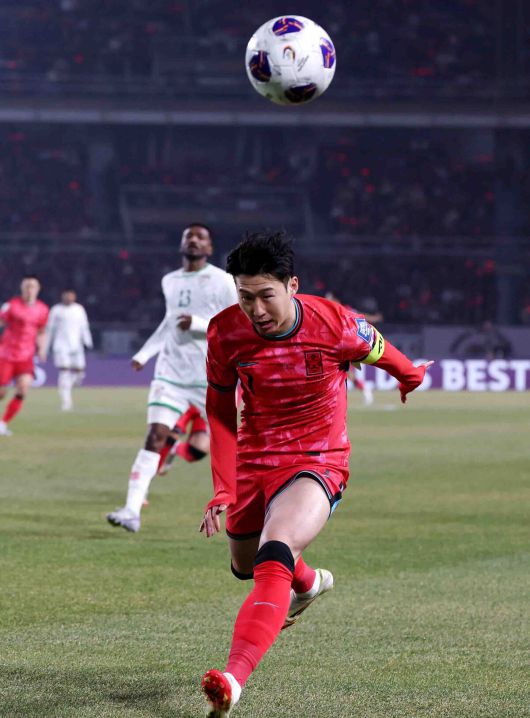 [고양=뉴시스] 추상철 기자 = 20일 오후 경기 고양시 고양종합운동장에서 열린 '2026 국제축구연맹(FIFA) 북중미 월드컵 아시아 지역 3차 예선 B조 7차전' 대한민국과 오만의 경기, 손흥민이 볼을 쫓아가고 있다. 사진=뉴시스 |