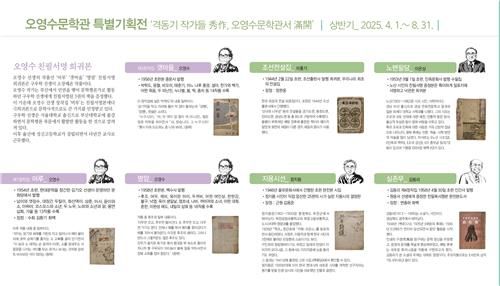 (울산=연합뉴스) 장영은 기자 = 울주문화재단은 오영수문학관이 제2의 도약을 위한 전시실 개편작업을 마친 기념으로 '격동기 작가들 수작(秀作), 오영수문학관서 만개(滿開)'라는 주제로 특별기획전을 개최한다고 24일 밝혔다.