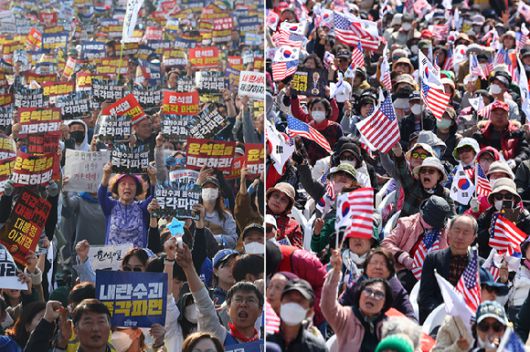 지난 22일 서울 종로구 동십자각 앞(왼쪽), 중구 세종대로(오른쪽)에서 각각 윤석열 탄핵 찬성·반대 집회가 열리고 있다. [사진=연합뉴스] |
