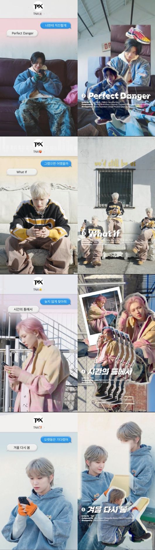 봄의 시작을 알리는 듯한 TNX의 풋풋한 무드 역시 시선을 사로잡는다. 화려하고 힙한 스타일링은 물론, 라이트 톤의 캐주얼 룩과 계절감을 살린 의상까지 더해져 이번 신보의 분위기를 감각적으로 담아냈다.
