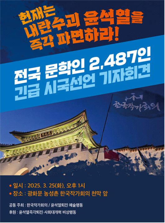 한국작가회의 관계자는 “이번 긴급 시국선언은 윤석열 대통령을 즉각 파면하고 훼손된 민주주의와 헌정 질서를 회복하기 위한 전국 문학인 2487인의 의지”라며 “전국 문학인들은 판결을 지연하고 있는 헌법재판소에 즉각 파면을 촉구한다”고 강조했다.