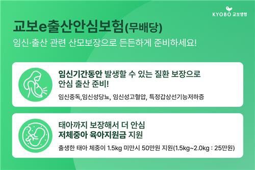 교보e출산안심보험은 건강케어(건강보험), 일상케어(헬스케어서비스), 지식케어(임신·출산 도서 지원) 등을 통해 임신과 출산을 돕는 건강보험이다.