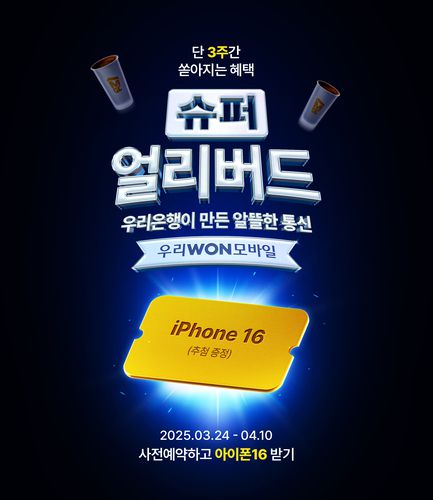 우리WON모바일 사전예약 이벤트는 우리WON뱅킹에서 알뜰폰을 사전예약만 해도 추첨을 통해 총 5만명에게 모바일 커피 쿠폰을 제공한다. 사전예약 후 알뜰폰을 개통한 고객에게는 △아이폰16 △백화점 상품권 1만원권을 추첨을 통해 제공한다. 이벤트를 카카오톡이나 문자 등을 통해 지인에게 공유할 경우 커피 쿠폰을 추가로 받을 수 있다.