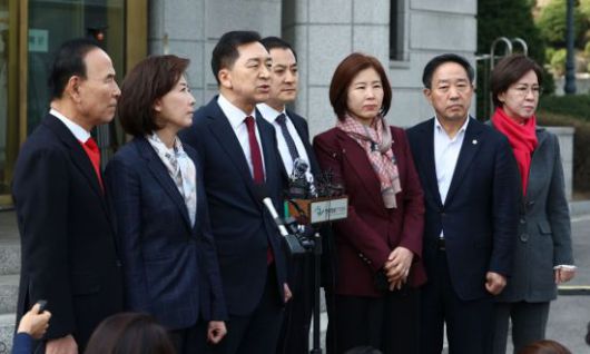 강승규·김기현·나경원·박대출·박덕흠 의원 등은 이날 헌법재판소 앞에서 기자회견을 열고 "이 대표가 얼마나 정략적 줄탄핵을 해왔는지 밝혀졌다"며 이같이 말했다.