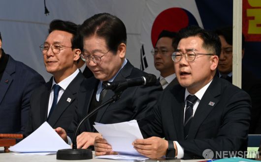 [서울=뉴스핌] 양윤모 기자 = 박찬대 더불어민주당 원내대표(오른쪽 두 번째)가 24일 오전 서울 종로구 광화문 더불어민주당 천막당사에서 열린 최고위원회의에서 발언하고 있다. [공동취재] 2025.03.24 yym58@newspim.com