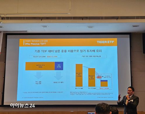 [아이뉴스24 정태현 기자] 미래에셋자산운용이 세계 최초로 패시브형 타겟데이트펀드(TDF) 상장지수펀드(ETF)인 'TIGER TDF2045 ETF(이하 TDF2045)'를 선보였다. 패시브형 특성상 기존 TDF ETF보다 운용 비용이 적고, 장기 수익률을 안정적으로 예측할 수 있다는 게 주요 특징이다.