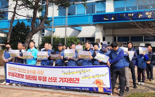 노조 조합원 30여명은 이날 오전 광주 서구 유촌동 전남지방우정청 앞에서 기자회견을 열고 "1천200원이던 운송 수수료는 최근 택배 물량 감소로 1천100원대로 떨어졌다"며 이같이 밝혔다.
